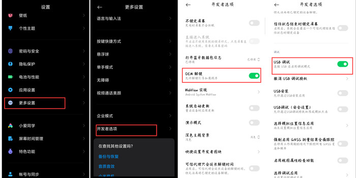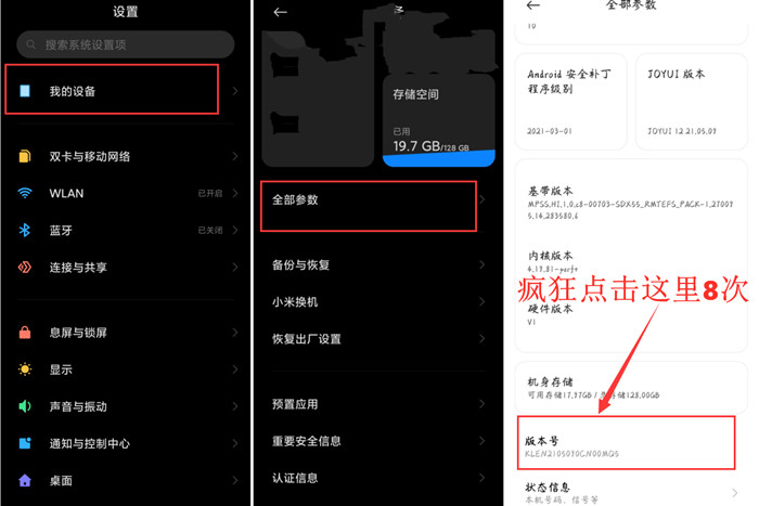 设置-我的设备-全部参数-版本号点击8次(激活隐藏的开发者选项)