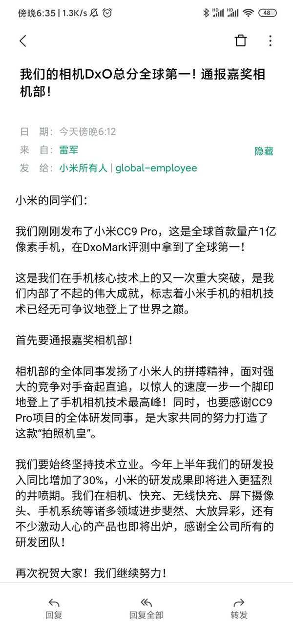 机相机部,雷军在内部信中称:“这是我们在手机核心技术上的又一次重大突破,是我