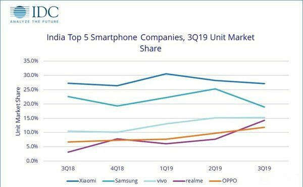 OPPO出货量为550万台,整体市场份额为12.7%,排名第五。