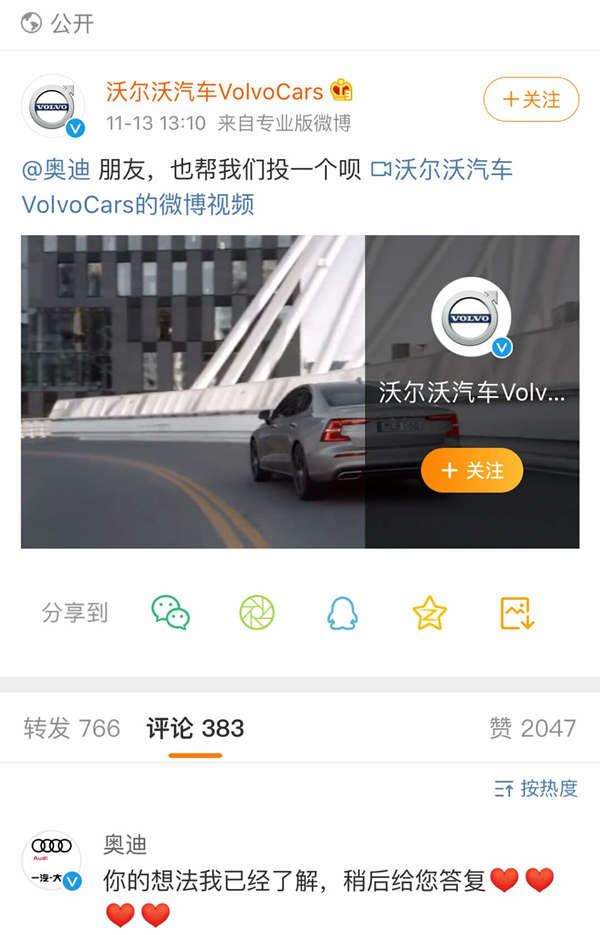 友,也帮我们投一个呗!”奥迪回复:你的想法我已经了解,稍后将给你回复!其他汽车品牌纷纷转发评论效仿。