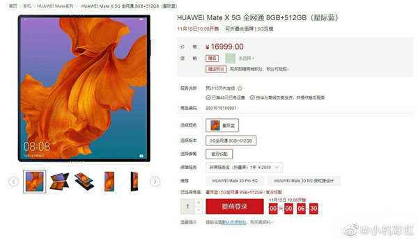 这次限量抢购的HUAWEI Mate X是CPU型号为麒麟980+巴龙5000,支持SA和NSA两种组网方式,并支持5G+4G双卡双待。全网通8GB+512GB(星际蓝)版售价16999元。由于产能有限,初期采取限量发售模式。据说“3秒能下载一部1G的电影,40分钟就可以充满电”。你会买吗,网上都说这款手机是年度理财产品了,买到手随便转手都要赚钱的。真的这么抢手吗?我们可以看下销售情况。