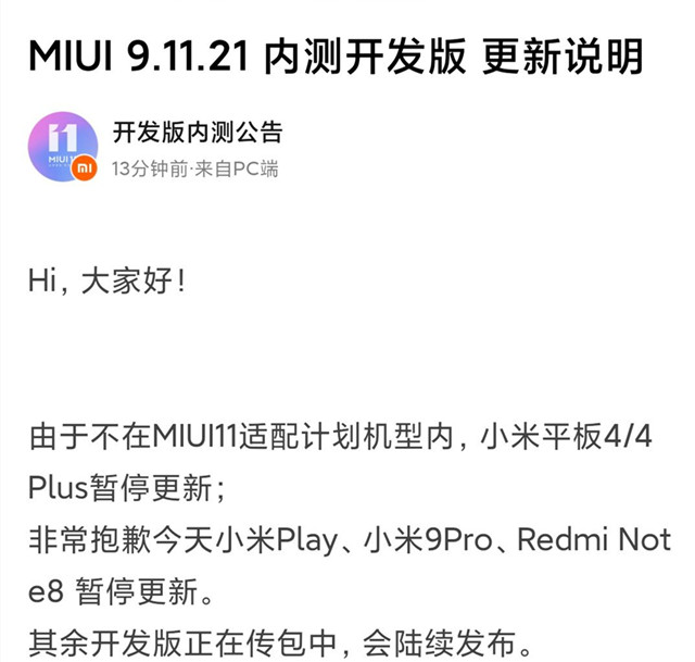 由于不在MIUI11适配更新计划中,小米平板4/小米平板4PLus开始暂停更新啦