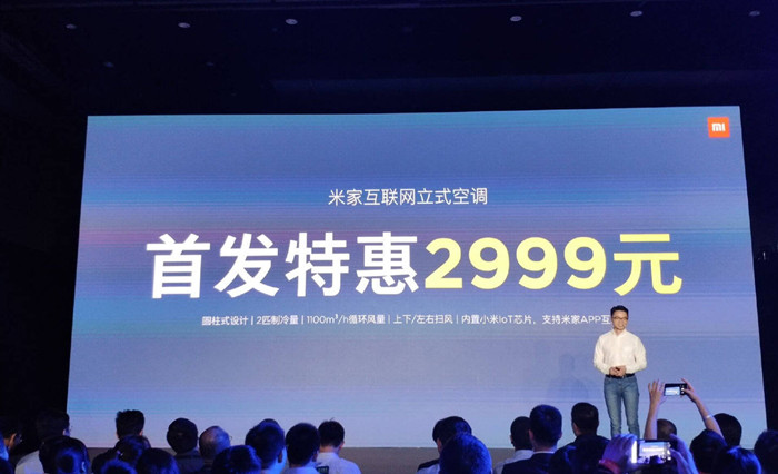 3.小米互联网立式空调,白色面板的隐藏式LED显示屏,按键触控,2匹制冷量,1100m³/h循环风量,三级效能,售价3499元,首发价2999元,4月23号16:00开始预约;