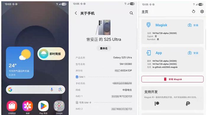 直接线刷OneUI8系统,会再次锁定BL,导致我们进入无限循环。实测维补AP分区也不能直接root成功,所以我们这里采用的是修改AP和CSC分区法,去除系统验证,来直接线刷8.0系统。升级8.0后,依旧采用维补init分区来获取完美root权限。暂时来看,三星安卓16底层不能刷KernelSU内核root权限,可能是新系统刚发布,第三方内核还没跟进编译,这里我们用的都是magisk。线刷过程中,一定要关注基带版本是否匹配,直接强刷或者版本不对应的情况下,都会导致你的手机不能启动。如不幸变砖,可下载ROM乐园最新版系统odin3救砖,恢复原机系统