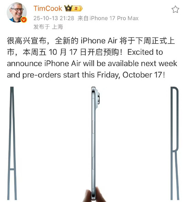 来自 Apple 的最新声明国行iPhone Air于10月17日(星期五)早9点起可预购采用突破设计的 iPhone Air机型,10月22日(星期三)起正式发售。